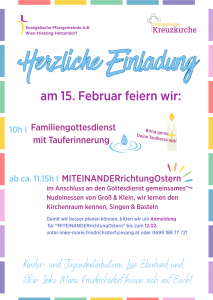 Die Reihe "MITEINANDER" findet ca. 4mal im Jahr statt, richtet sich an Kinder und Eltern und widmet sich ungezwungen unterschiedlichen Themen. Der nächste Termin ist am 15. Februar ab ca. 11.15h (nach dem Tauferinnerungsgottesdienst). Kinder- und Jugendmitarbeiterin Lisa Eberhard und Pfr.in Imke Marie Friedrichsdorf laden ein zum gemeinsamen Mittagessen, plaudern, singen, basteln und spielen. Damit wir besser planen können bitten wir um Anmeldung bis zum 12. Februar unter: imke-marie.friedrichsdorf@evang.at