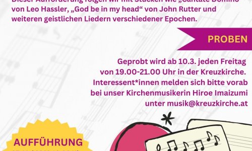 Addresse: KreuzkircheCumberlandstraße 481140 WienFreitag, 7 April 2023 - 7:00nachmittags bis 9:00nachmittagsChorprobe zum Chorprojekt am Kantatesonntag 07. Mai 2023
